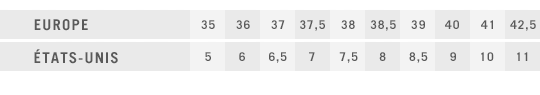 Trouvez les modèles offerts dans votre pointure en utilisant le menu déroulant à droite. Vous pouvez aussi effectuer une recherche avancée par catégorie, couleur ou prix. Les pointures offertes sur notre site sont les mêmes que celles présentées dans nos magasins. |